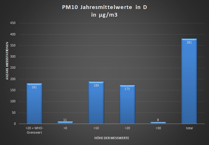 Bei den Feinstaub-Grenzwerten überschreitet Deutschland an drei Prozent aller Messstationen den Grenzwert für das Tagesmittel (wobei 35 Überschreitungen pro Kalenderjahr „zugelassen“ sind). Seit 2009 sind wegen Überschreitungen von Feinstaub und PM10 daher schon zwei Vertragsverletzungsverfahren der EU eingeleitet worden (damit ist Deutschland unrühmlicher Europameister nach Anzahl der Vertragsverletzungsverfahren zu Luftschadstoffen). Schaut man sich übrigens die Empfehlungen der WHO an, wird der Grenzwert von maximal 50 μg/m³ im Tagesmittel an nicht mehr als drei Tagen an 89 Prozent der Messstationen überschritten; bei PM2,5 sogar an allen Messstationen. Ähnlich hoch sind die Werte auch bei Ozon. Die Einhaltung der WHO-Grenzwerte strebt die Bundesregierung nach eigenen Aussagen allerdings nicht einmal an.