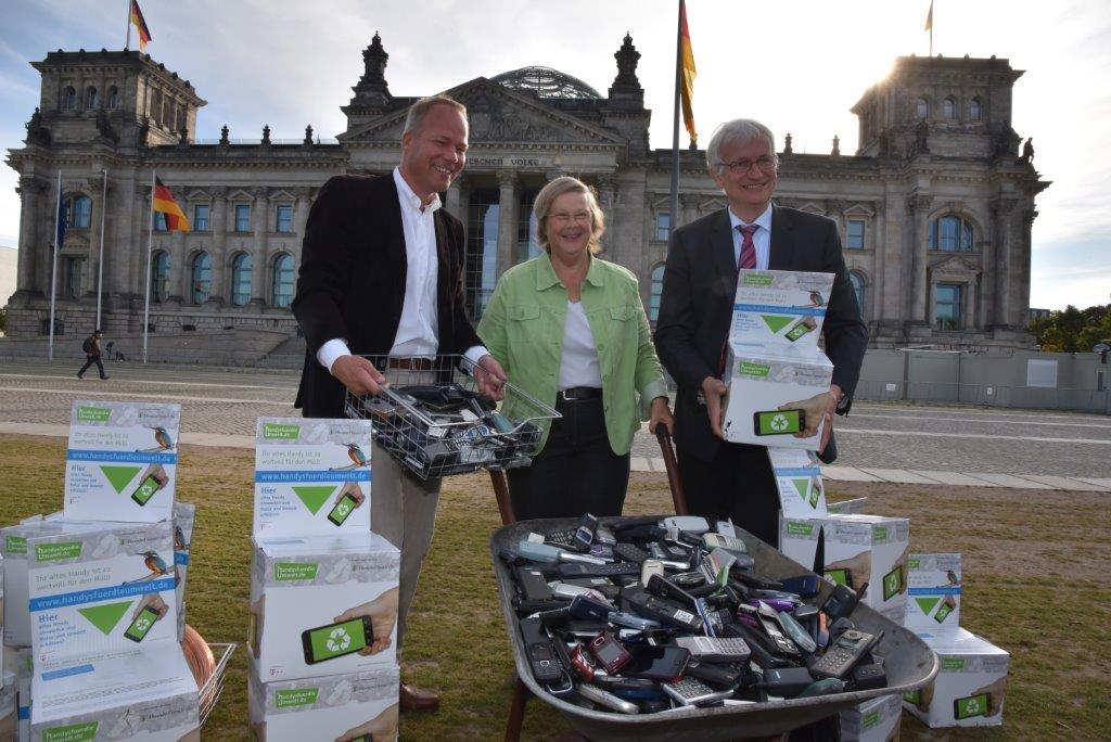 Mehr als 100 Millionen nicht mehr gebrauchte Handys liegen in den Schubladen der Bundesbürger. Die darin enthaltenen Rohstoffe summieren sich auf rund 120 Millionen Euro. Bärbel Höhn als Vorsitzende des Umweltausschusses hat zusammen mit den anderen Fraktionen hier im Reichstag zu einer Althandy-Sammelaktion aufgerufen – um wenigstens einen kleinen Teil dieses „Schubladen-Schatzes“ zu heben und zu recyceln.